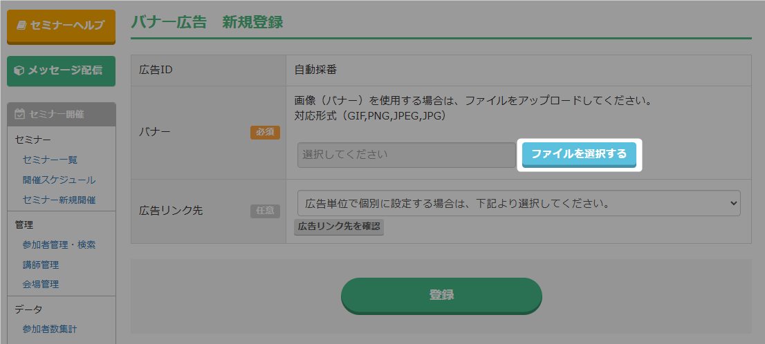 - 「セミナー開催」をクリック。