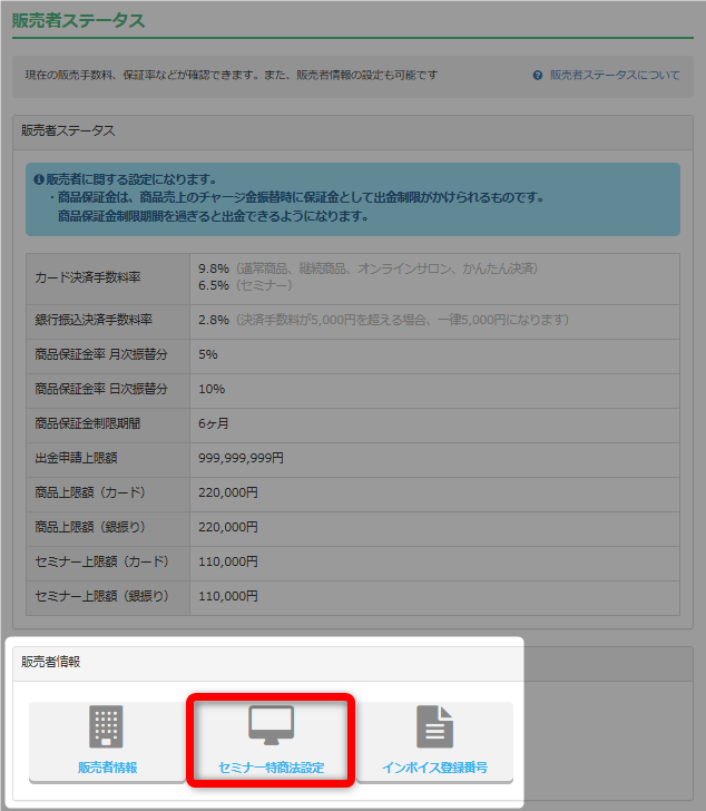 「販売者情報」と「セミナー特定商取引」の登録内容変更手順について解説いたします。