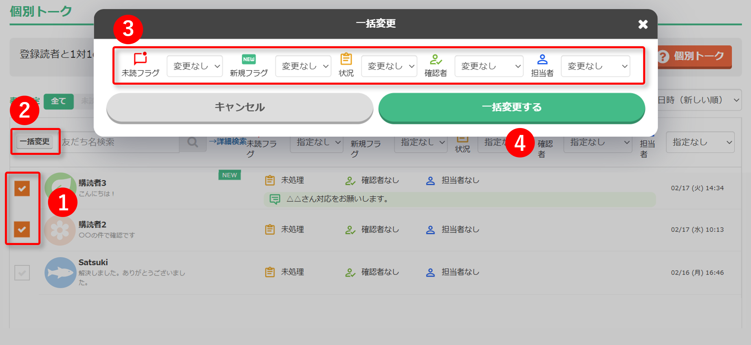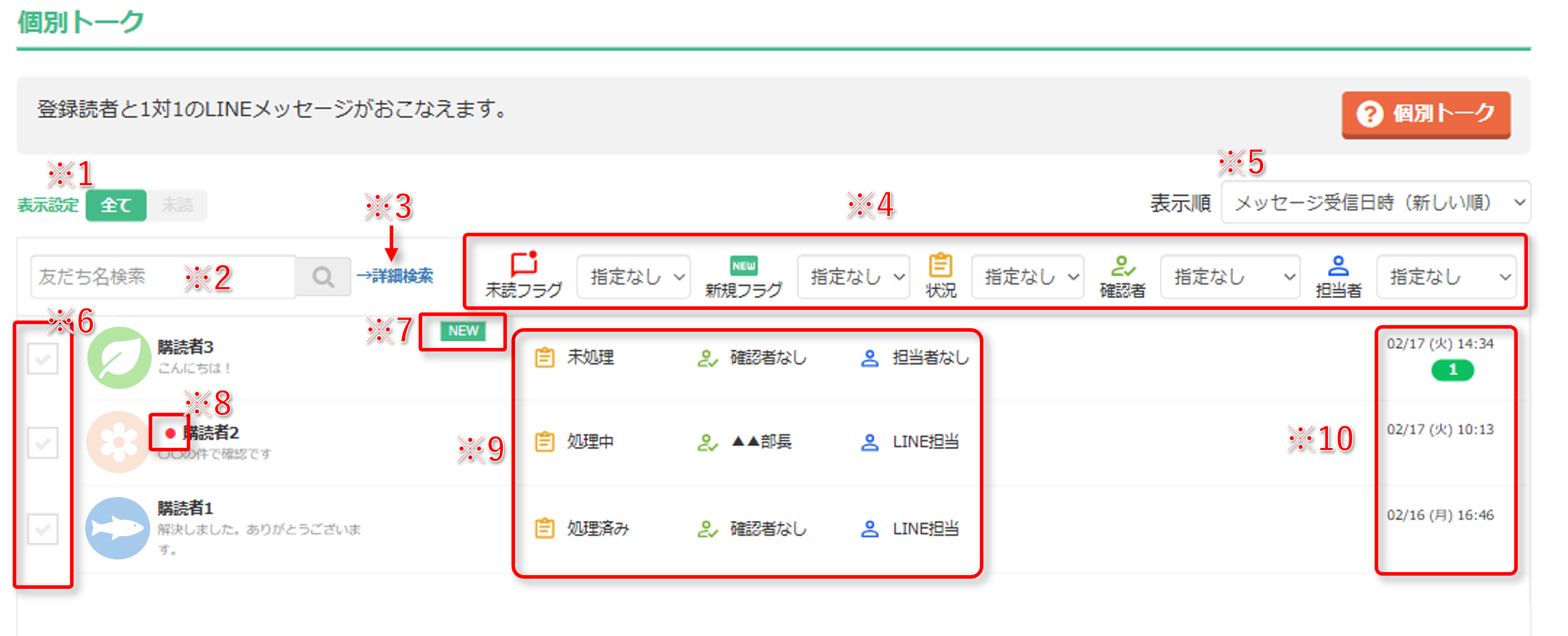 未読 :通知(※10の表示がある方)のトークがある友だちを表示できます。※2 友だち名検索 友だち名で検索すると、該当する友だちのみが一覧に表示されます。 ※3 詳細検索 絞り込み条件を設定し、「適用する」をクリックすることで、該当の友だちのみ