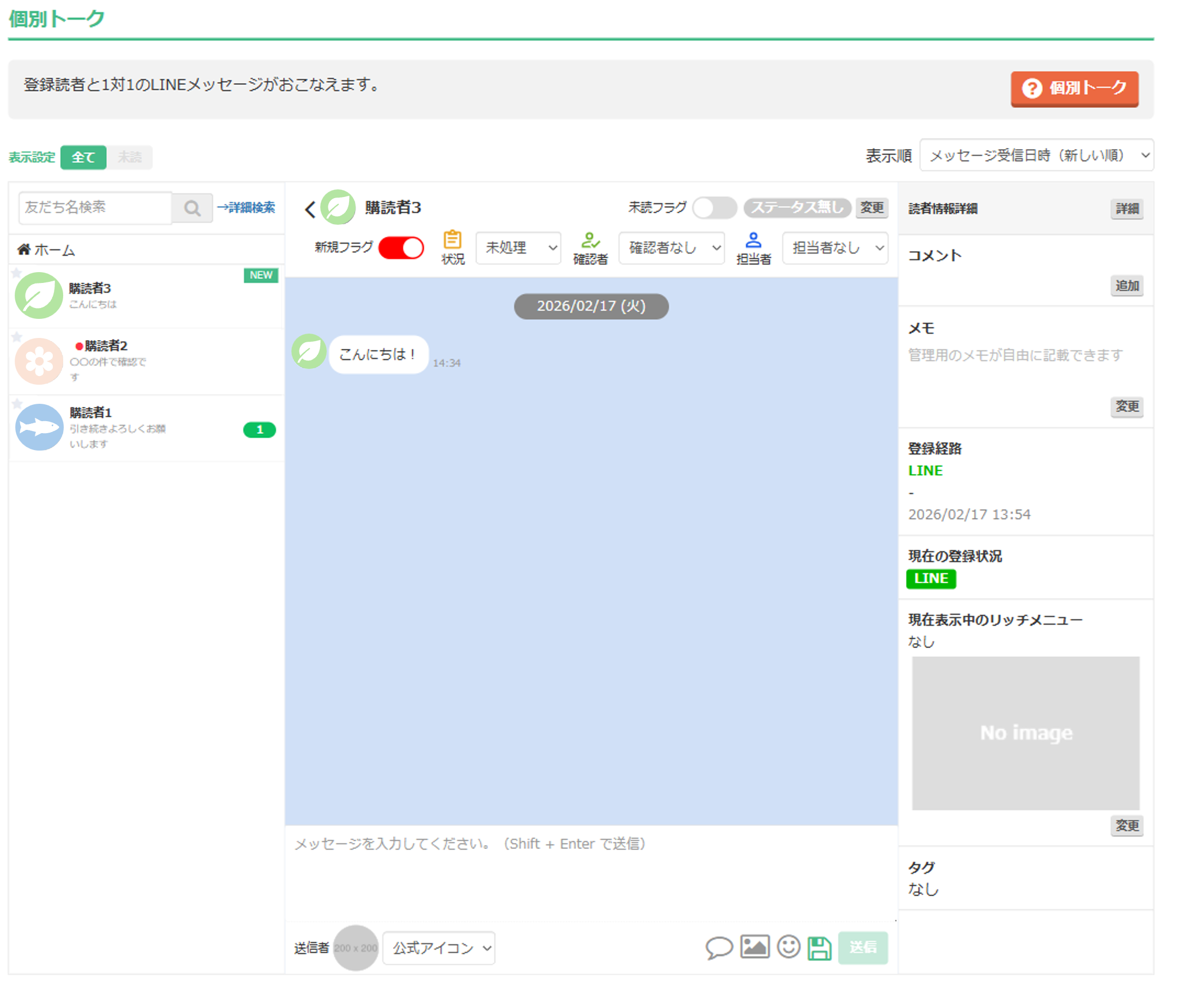 個別トークとは、登録読者と1対1のやり取りをおこなえるメッセージ送信機能です。