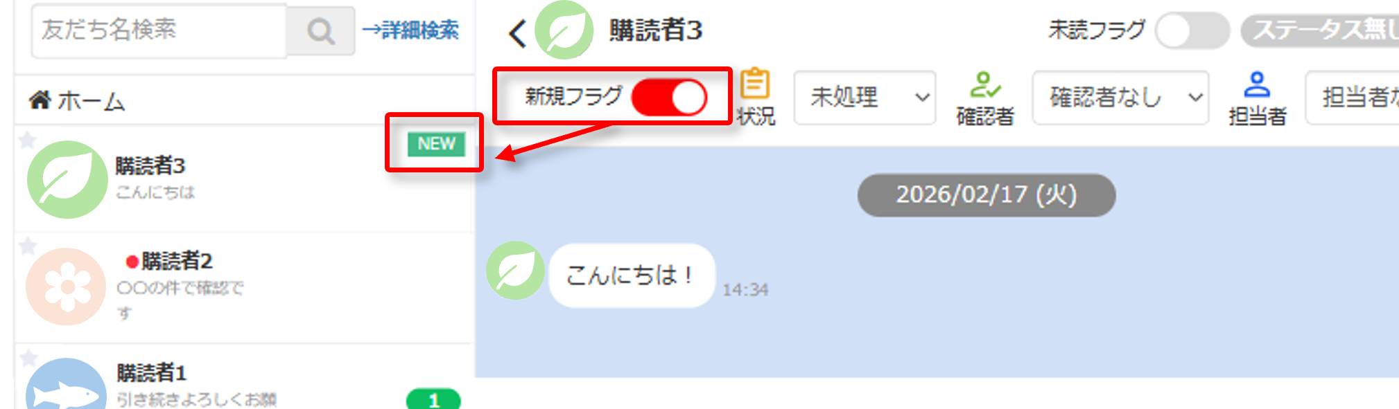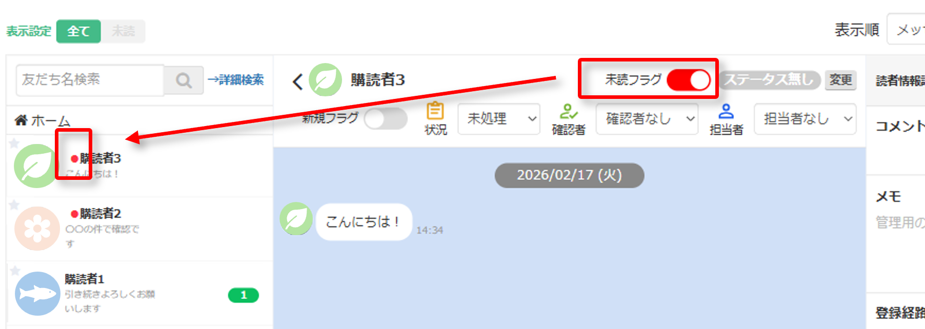こちらからメッセージを回答することで自動でフラグが外れます。※手動でもON/OFFの切り替えが可能です