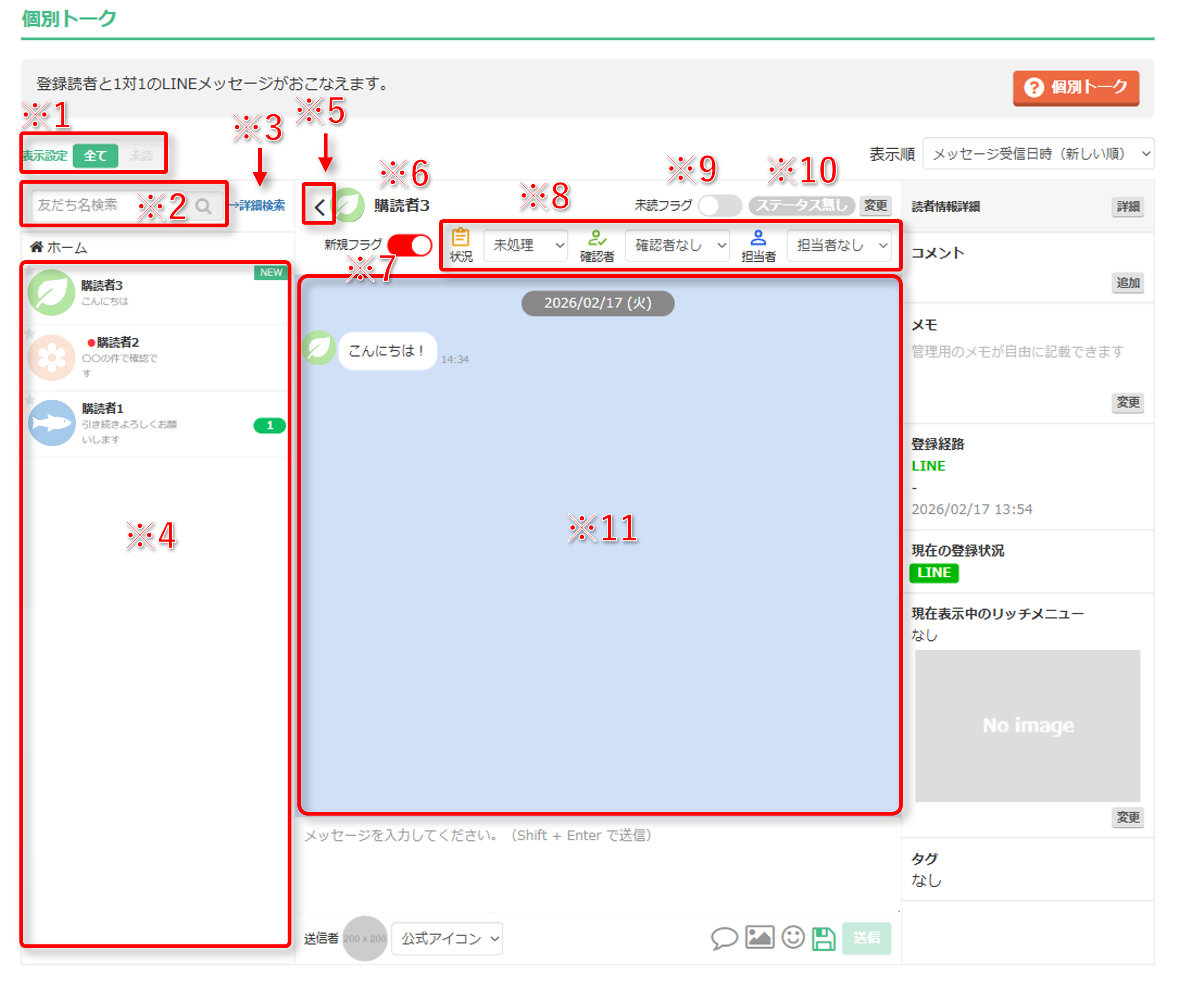 | ※11 トーク画面 | この友だちとのトーク内容が表示されます。 |