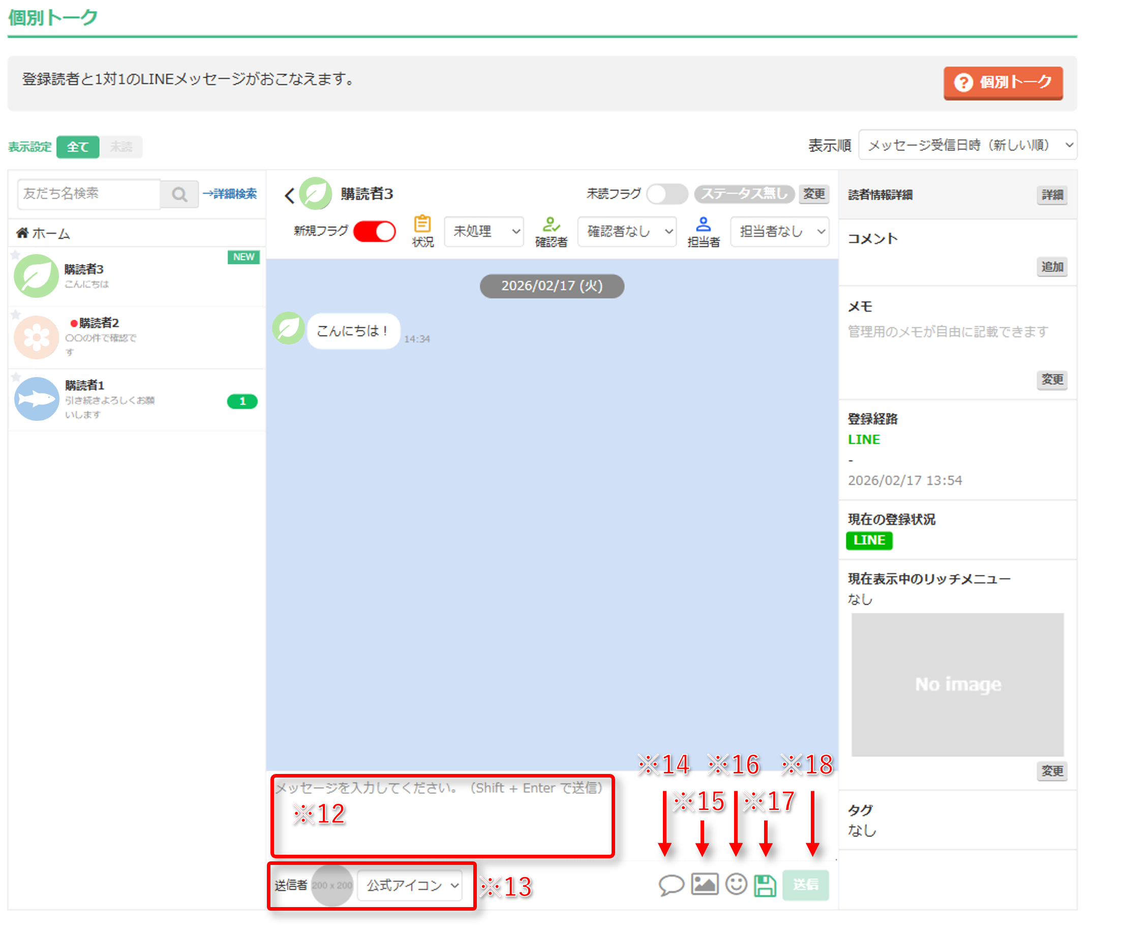 | ※12 メッセージ入力欄 | メッセージを入力する欄です。メッセージ入力後、 「送信(※18)」をクリックすることでメッセージが送信されます。 |