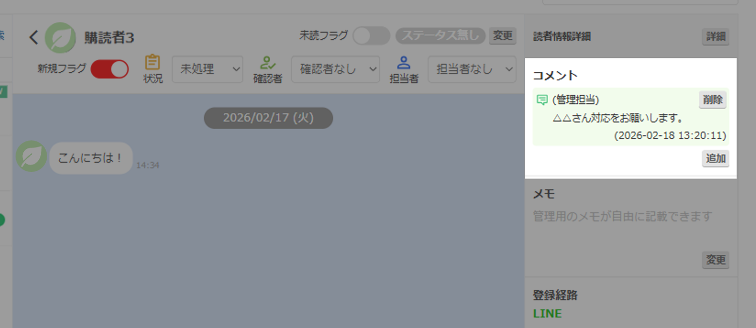 管理用のコメントです。 オペレーター間での引き継ぎ事項などをご入力ください。 記載したコメントは、1階層上の友だち一覧画面でも確認できます。 |