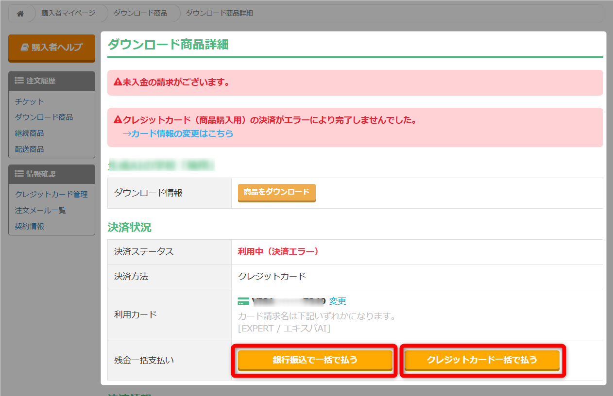 ⇒ 購入商品(商品詳細ページ)の確認手順 - 残金一括支払い欄にある「銀行振込で一括で払う」または「クレジットカードで払う」をクリック。