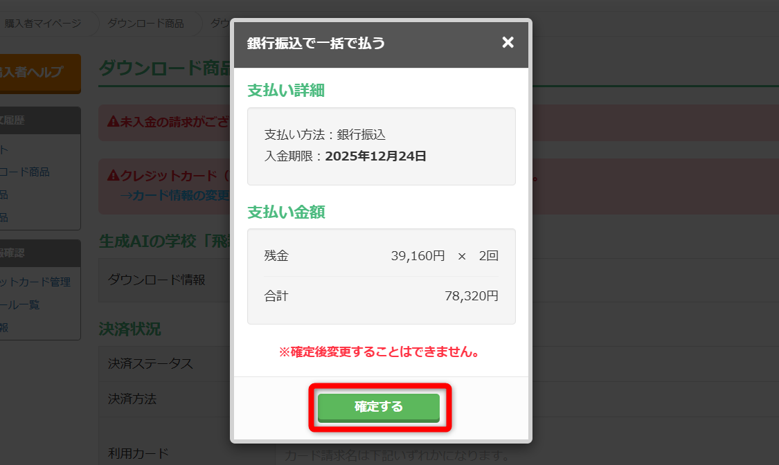 ※ご登録のメールアドレスにも振込先情報を送信しております。クレカ一括の場合: