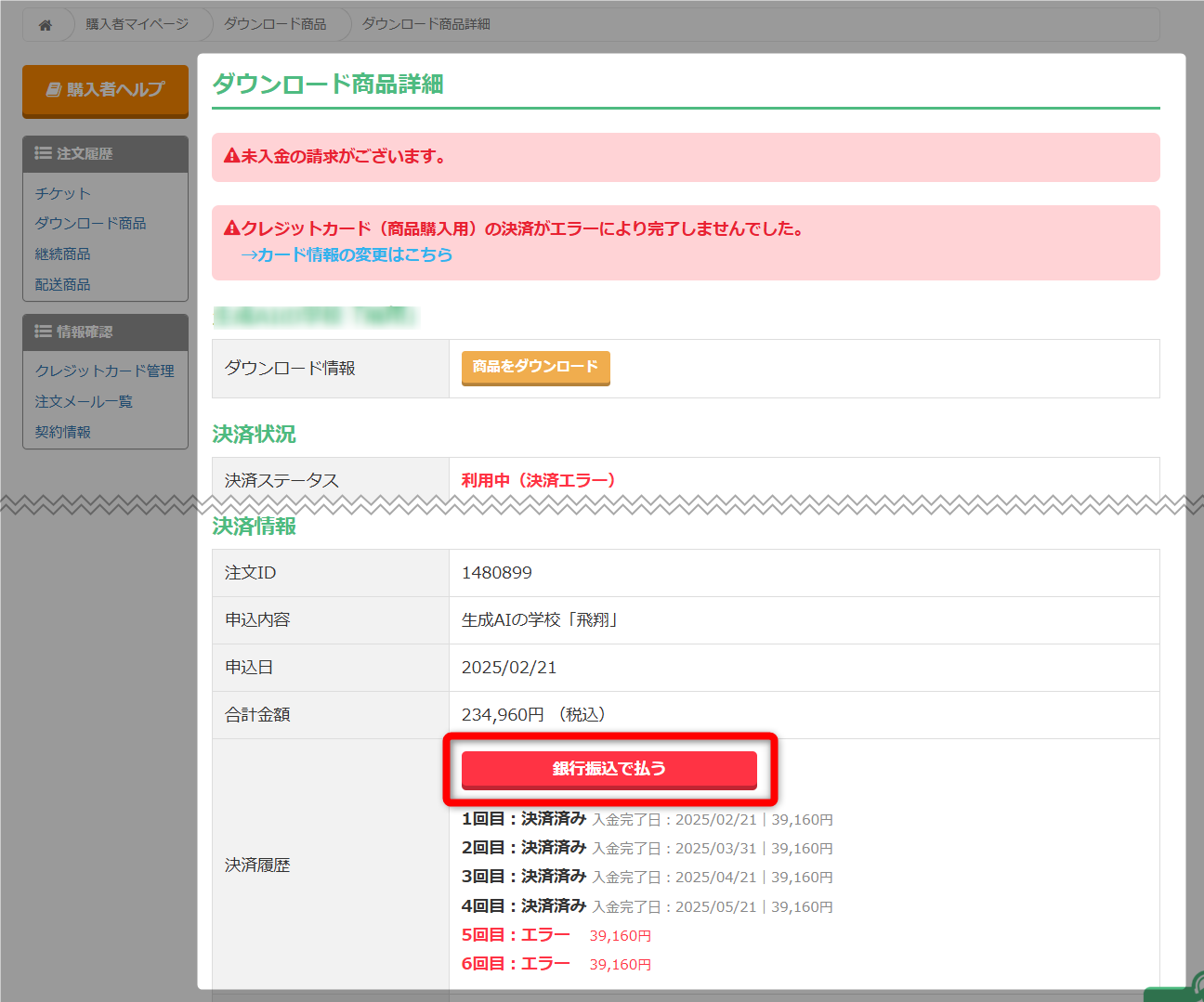 ⇒ 購入商品(商品詳細ページ)の確認手順 - 決済履歴欄にある「銀行振込で払う」をクリック。