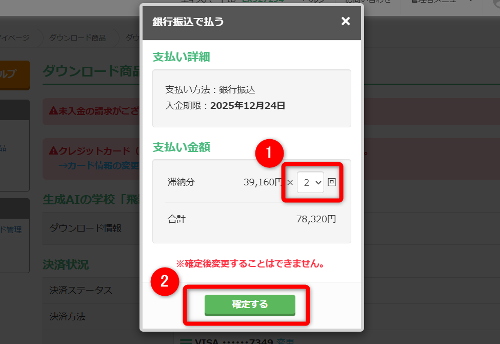 確定後、変更することはできませんのでご注意ください。 - 画面に振込先の銀行口座情報が表示されるので、期日までにお振込みをお願いいたします。